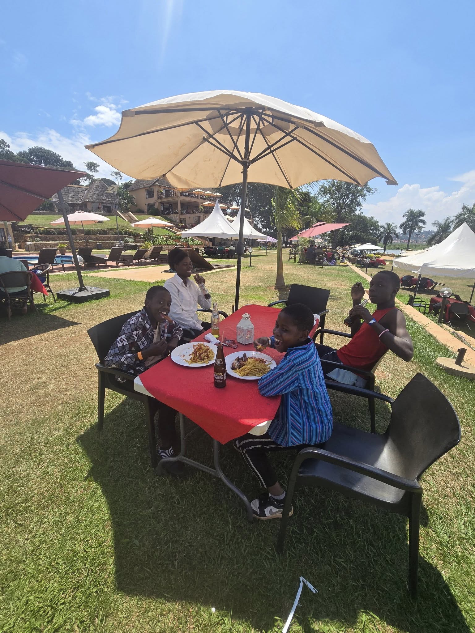 Na het zwemmen volgt nog een verrassing! Op de lange tafels komt voor ieder kind een bord met friet, kipstukjes en een flesje drinken, wat een feest! De kinderen zijn zo dankbaar!
